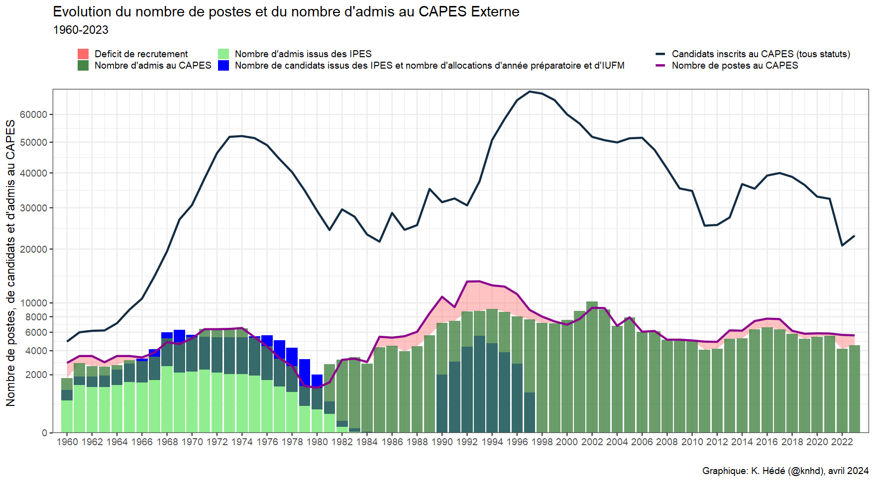 En l'absence de série longue historique publiée par le ministère de l'éducation nationale, nous avons reconstitué, à partir des différentes publications statistiques accessibles sur le portail d'archives statistiques de la DEPP, les données des concours depuis 1960.